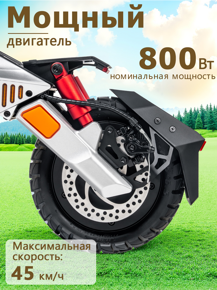 Электродвигатель мощностью 800 Вт питается от аккумуляторной батареи емкостью 18200 мА·ч. Максимальная скорость достигает 45 км/ч, что позволяет динамично передвигаться в городском потоке и не отставать от общего ритма движения. Запас хода на одном заряде составляет до 64 км, чего достаточно для длительных поездок и активного использования в течение дня.