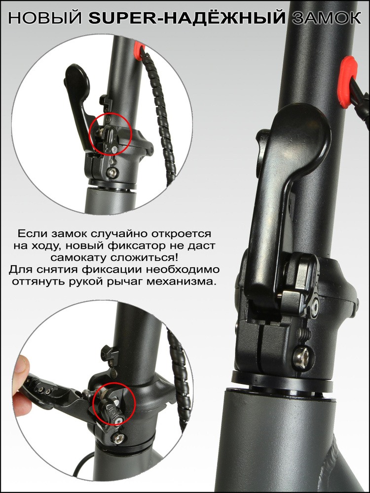 • Реализован новый, более надёжный и безопасный замок рулевой стойки, даже при случайном открытии замка во время движения, он будет удерживаться дополнительным фиксатором и не даст сложиться самокату на полном ходу. • Установлено новое, защитное стекло на дисплей.