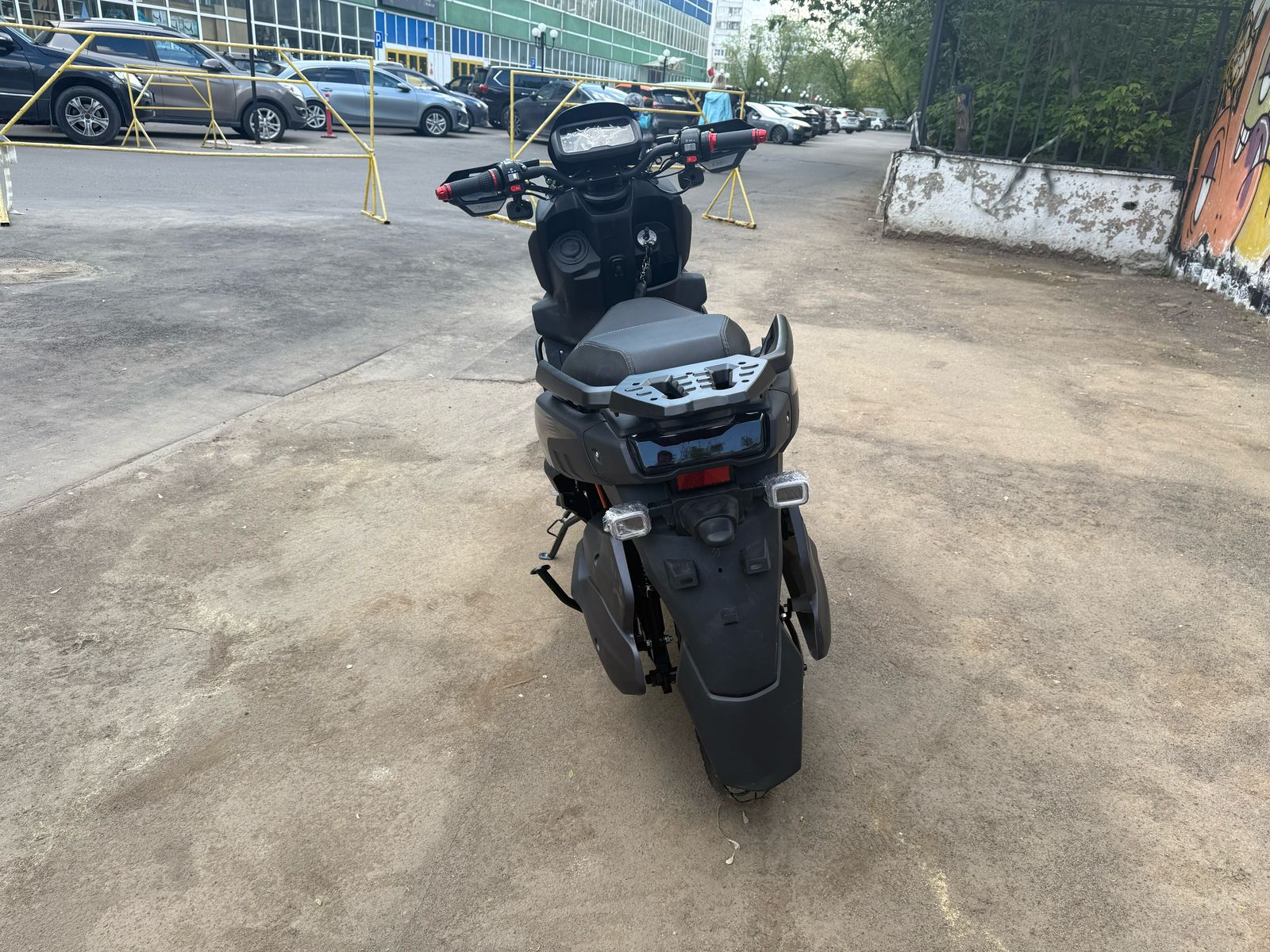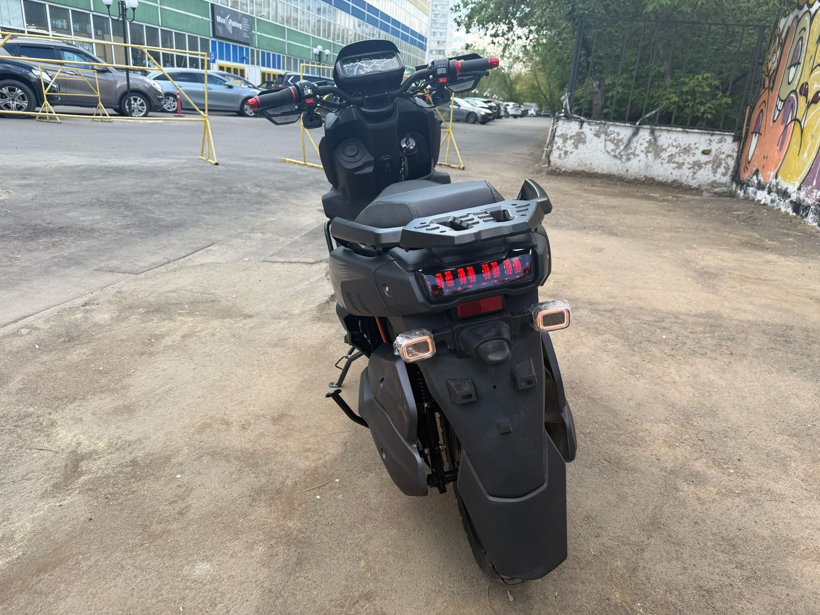 Задняя часть также защищена алюминиевыми дугами, что сохраняет скутер в отличном состоянии даже при падениях или случайных ударах, особенно полезно для загородных поездок по неровным трассам.