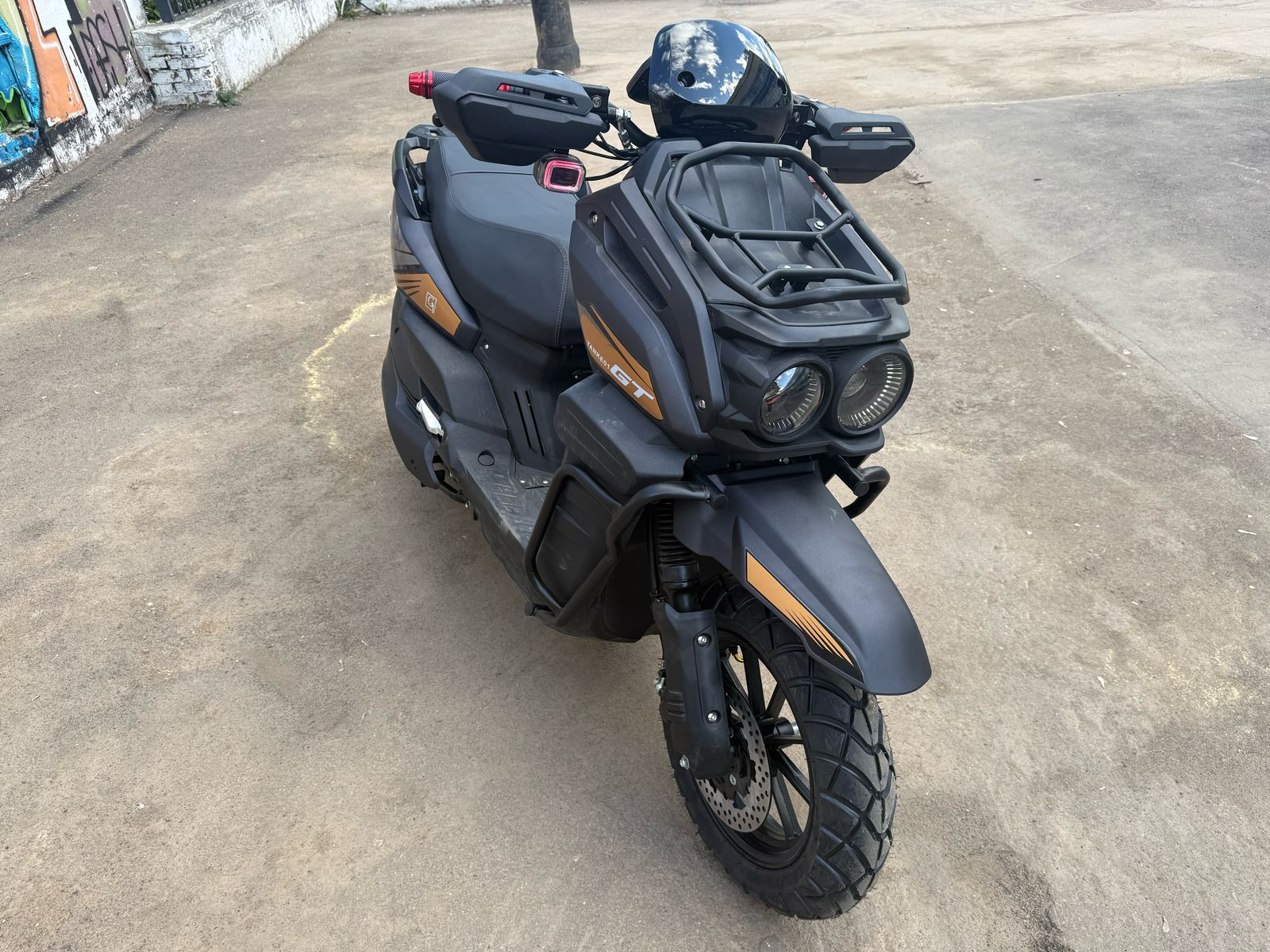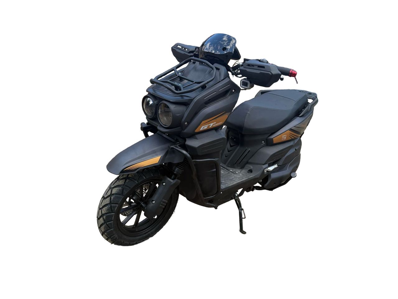 Впечатляющая передняя часть с двумя круглыми фарами, обрамленными защитными элементами, придает скутеру агрессивный и технологичный вид. Насыщенные оттенки и графические элементы с логотипом "TANK" делают этот скутер заметным и подчеркивают его спортивный характер.